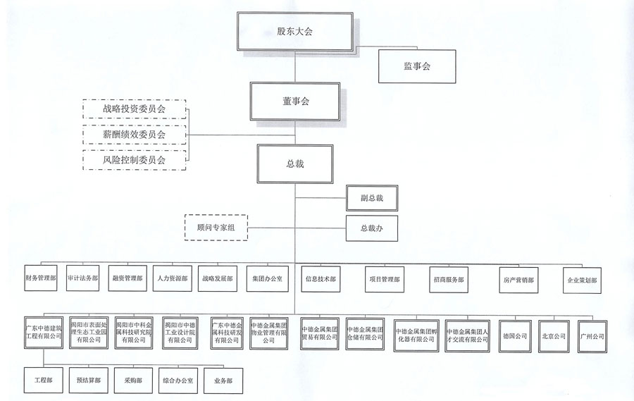 中德金屬集團按“三會一層”的管理思想,組建了職能完善、結構清晰的組織架構。在經營層面,以總裁為核心,成立了集團辦公室、戰略發展部、人力資源部、融資管理部、審計法務部、財務管理部、信息技術部、項目管理部、招商服務部、房產營銷部、企業策劃部等十一個核心職能部門。同時,下轄十三家子公司。
