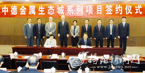 11月19日下午,德國RSBK戰略咨詢交流有限公司總裁魯道夫•沙爾平率德國企業家代表團蒞揭訪問,與揭陽市金屬企業聯合會就中德金屬生態城項目對接進行洽談,雙方在榕江大酒店成功舉行了系列項目合作協議簽約活動。德國代表團還于20日下午趕赴廣州,出席中德金屬生態城駐廣州辦事處揭牌儀式。省政協副主席、省知識產權局局長陶凱元,市委書記、市人大常委會主任陳綠平,省政府副秘書長劉曉捷,市委副書記、市長陳東等領導出席了活動。