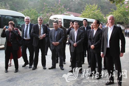 中德金屬生態城創新發展探求座談會今天在我市舉行。7日,出席座談會的中聯部副部長李進軍、德國駐廣州總領事高思范(Stefan Gallon)等領導和嘉賓到我市有關地方參觀考察(見圖。楊繼斌 攝),對我市經濟社會快速發展給予高度評價,認為我市在發展特色產業、推動傳統產業轉型升級、加強國際合作等方面都具有前瞻性,取得重大成就,揭陽發展潛力巨大,發展前景廣闊。市委書記、市人大常委會主任陳綠平,市委副書記、市長陳東等參加活動。