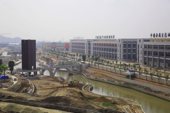 中德金屬生態(tài)城雕塑公園北岸場地已進(jìn)行鐵欄桿電焊和景觀塔裝飾燈安裝