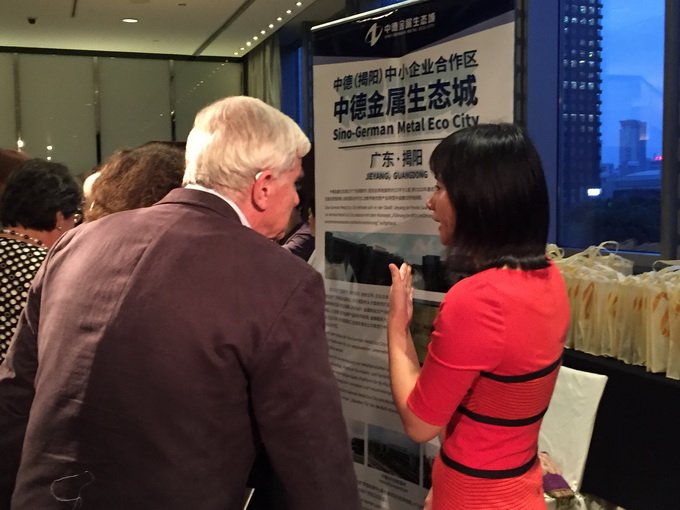 10月12日,受德國駐廣州領事館的邀請,中德金屬集團副總裁晉衛東攜集團招商、營銷等部門主要人員參加了德國統一25周年德國國慶日活動。活動現場來自中德兩國的各個協會、機構及企業代表借藝術形式進行商務、文化交流。作為華南區首個中德中小企業合作區,中德金屬生態城項目一直以來得到了德國駐廣州總領館的大力支持。呂海慕總領事在致辭中提出,希望能進一步促進中德之間的合作,對揭陽的中德合作成果表示充分肯定。廣東省政府副秘書長羅娟參加了活動并致辭,她提出,廣東省政府將繼續支持中德金屬生態城這一中德合作平臺,促進廣東與德國的合作。