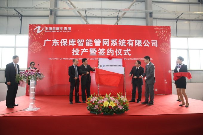 經過連續8個月的緊張籌建,廣東保庫智能管網系統有限公司首條生產線于21日成功投產,成為中德金屬生態城首家投產企業。揭陽對德合作“百人團”首獲碩果,標志著中德金屬生態城對德(歐)合作邁出了具有實質性意義的重要一步。副市長張時義等市領導及中德金屬集團相關領導參加活動。
