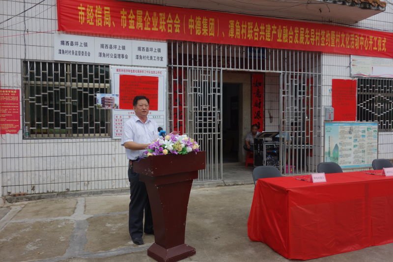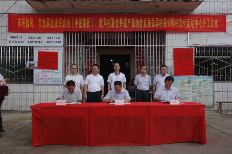 根據揭陽市委、市政府關于動員市社會組織參與精準扶貧的指示精神,9月6日上午,市經信局、市金屬企業聯合會、中德金屬集團與揭西縣坪上鎮潭角村聯合舉行共建產業融合發展先導村簽約暨村文化活動中心開工儀式,爭取把該村打造成揭陽互聯網+精準扶貧、精準脫貧的示范村,推動貧困戶早日脫貧致富。