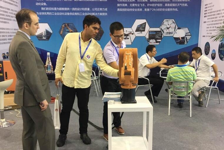 加德偉公司的智能機械臂引起境外采購商的注意。圖為公司參展負責人現場展示產品功能